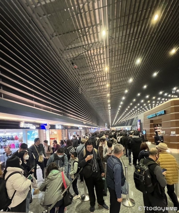 有旅客投訴指出,今早至桃機第一航廈搭機,他已提早兩小時抵達機場,想不到通關隊伍竟從樓上排到樓下,排隊等了1小時才等到安檢,不少航空公司到隊伍中找客人,保全也要求旅客好好排隊,有旅客擔心趕不上飛機大聲催趕,現場情形十分混亂。