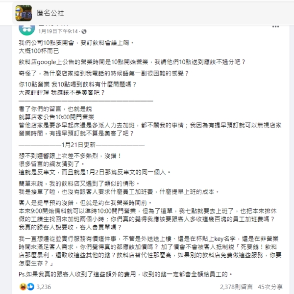 這名網友在臉書社團「匿名公社」上發文表示,他們公司因為早上10時要開會,所以他決定提前訂飲料,「大概100杯而已」。上網查詢後,他得知某飲料店的營業時間是10時,「我請他們10點送到應該不過分吧?」然而店家反應卻與他所想像的不同。