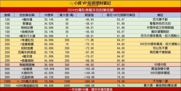 臉書粉專「小資yp投資理財筆記」昨(28)日就貼出「2024刮刮樂購買攻略」,可見17款刮刮樂的中獎率、期望值,以及每100元預期可拿回的金額,若想「穩中」,可以挑選500元的「金龍獎」。