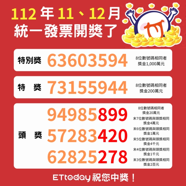 財政部公布2023年11-12月統一發票中獎號碼,1000萬特別獎為「63603594」,一共開出13張千萬大獎;另外,200萬元特獎則開出17張。