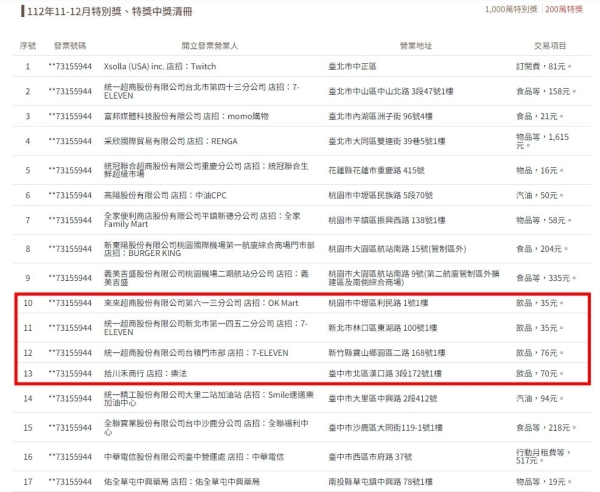 2023年11~12月期統一發票1月25日開獎,千萬特別獎號碼為「63603594」,200萬特獎號「73155944」,中獎張數13張;特獎「73155944」中獎張數17張。根據中獎清冊,有4名幸運兒消費不到100元購買飲料,就抱回發票200萬元特獎,趕快拿出發票確認是不是意外幫自己加了年終!
