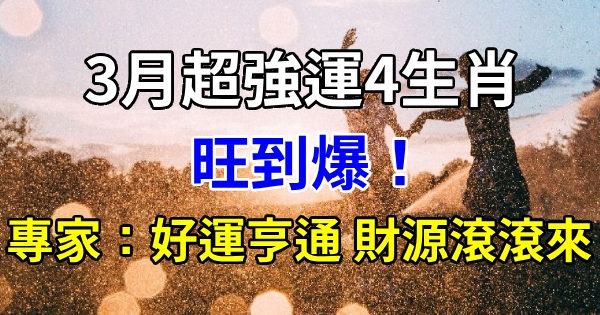 3月份來臨,新的一個月大家都希望獲得老天眷顧,《搜狐網》運勢專欄點名了包括屬鼠、屬羊、屬龍、屬豬等四個生肖的朋友,即將在3月份好運連連,財運亨通,事業節節高升。