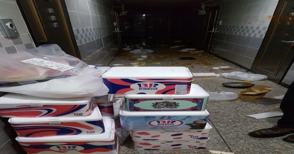 從外送員拍下的照片中可以看到,走廊滿布裝食物的塑膠容器,紅色的湯汁和食物殘渣散落一地,驚人的是後續還不斷有外送員送食物過來,門口又再度堆滿將近10箱保麗龍餐盒。