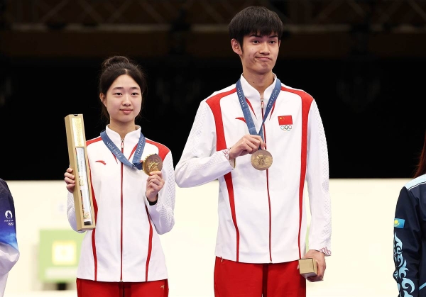 射擊混合團體10米氣步槍金牌得主盛李豪和黃雨婷,在頒獎儀式上收到了一份神秘的禮物——一個長條形盒子。