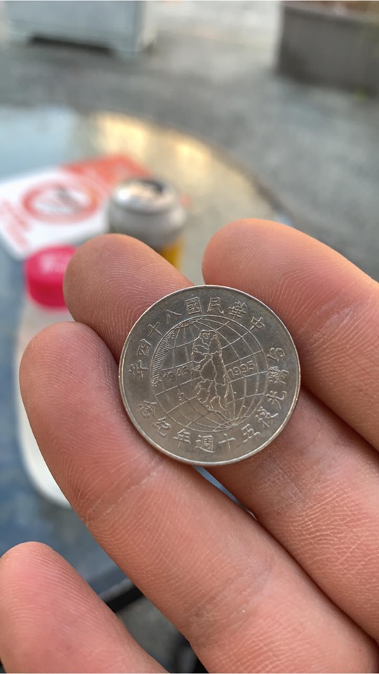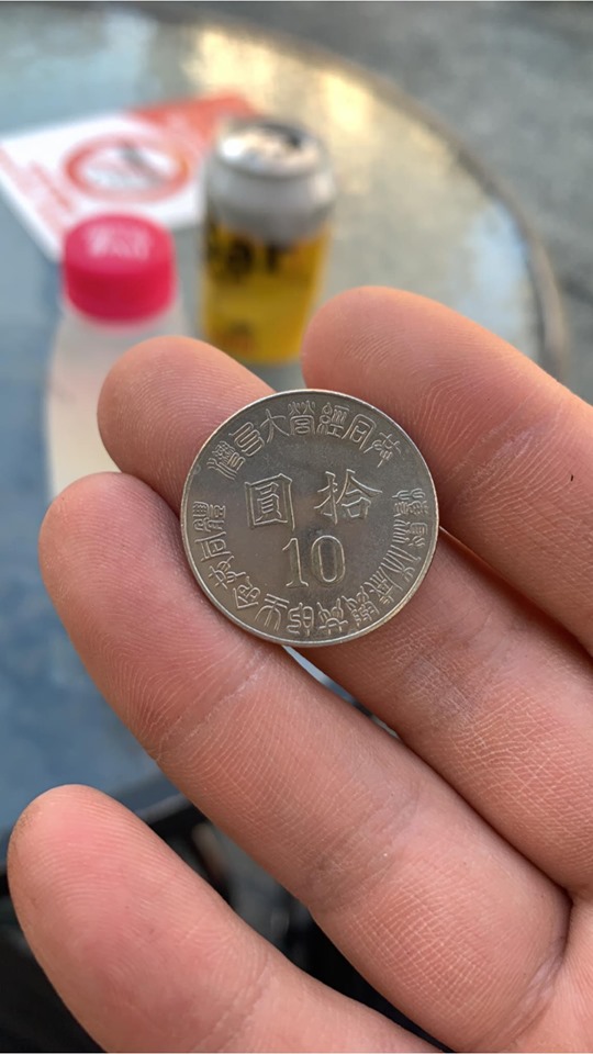 從原PO上傳的照片中可以看到,他手裡的10元硬幣,無論是字體還是圖案,都和一般的硬幣不太一樣。但事實上,這枚硬幣是台灣在民國84年10月23日發行的紀念幣,為了慶祝「台灣光復50週年」而特別發行。這枚硬幣的正面有台灣地圖以及地球的圖案,背面則有「共同經營大台灣」、「搏聚休戚與共的生命共同體」等字樣。目前這枚紀念幣仍然是可以正常使用的。