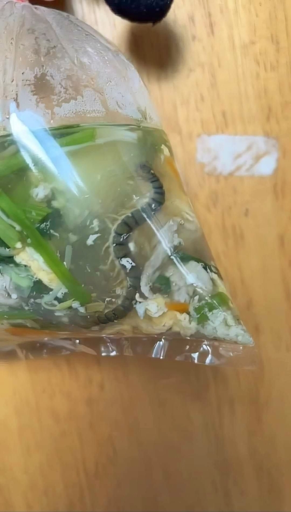 在原PO分享的照片中,塑膠袋裡裝著蛋花湯,但仔細一看,湯裡竟然出現了一條分成幾節、形狀像蛇的動物屍體,讓他瞬間頭皮發麻,崩潰寫道:「這應該不是冬蟲夏草吧?」文章一經曝光,立刻吸引大批網友圍觀、熱烈留言。