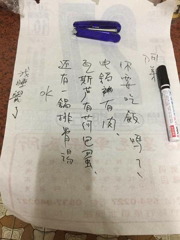 這位網友在《爆廢公社》上分享了媽媽留在桌上的紙條。那天他晚歸,媽媽擔心他還沒吃飽,特地準備了飯菜,並在紙條上寫道:「阿弟,你要吃飯嗎?電鍋裡有肉,瓦斯爐上有荷包蛋,還有一鍋排骨湯,OK,我去睡覺了!」簡短的字句中充滿了對兒子的深切關愛。