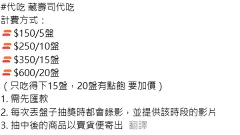 例如,有人發現社群平台Threads上出現了專門提供「代吃服務」的貼文,這些服務提供者會根據消費者的需求按盤數收費,並保證全程錄影,甚至有網友戲稱這是一種「爽缺」。