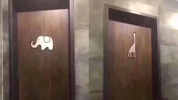 日本有一間「奇葩」的廁所,廁所里男女廁所門口分別是兩扇木門,一扇門上面是「大象」圖案,另一扇門上面則是「長頸鹿」的圖案。