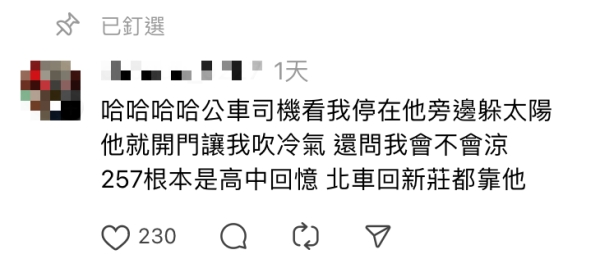此外,也出現不少人認出是哪台公車,「這個看起來像257然後在中平中原路口那邊」、「257根本是高中回憶,北車回新莊都靠他」、「257公車司機」,或是熱心網友擔心司機的善心會讓自己遭受檢舉,「真的是很熱心啦,就怕有人檢舉離站開門」、「謝謝司機大哥,好人一生平安」、「然後又被檢舉魔人檢舉」。