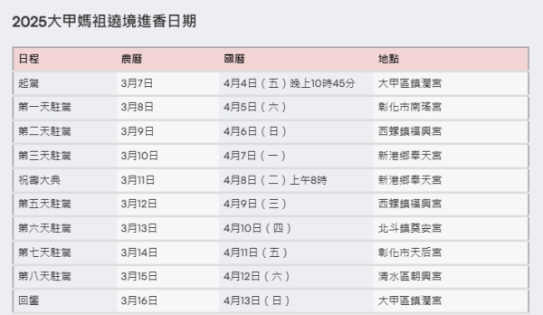 大甲媽祖日程表。(截圖取自/大甲鎮瀾宮粉絲團)