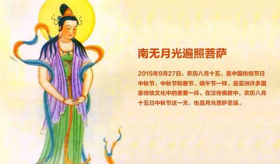 在漢傳佛教中,農曆八月十五日中秋節這一天,也是月光菩薩聖誕。月光菩薩,又稱月凈菩薩、月光遍照菩薩,與日光菩薩同為藥師如來之脅侍。