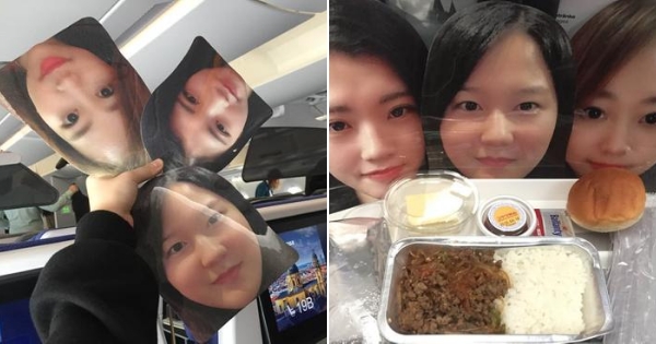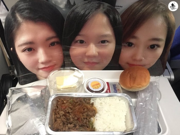 獨自上飛機的Soo Yeon為了讓長途漫漫的旅程不那麼的孤單,因此便將三位好朋友的大頭照立在飛機桌,好能陪伴她度過這煎熬的時刻~