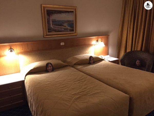 到了飯店後,也立刻將三位好友的照片立在枕頭上~
