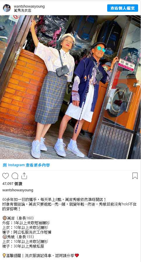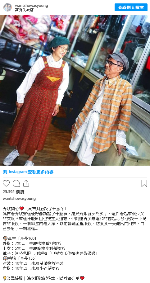 從IG上可以看到,原本被堆放在店內數年的衣服,在孫子的巧手搭配之下不但意外變成最有味道的時髦單品,甚至再與萬吉、秀娥自己珍藏多年的私服相互搭配後,更是毫無違和感地將兩人的穿搭弄成為深受許多人喜愛的古著風格~