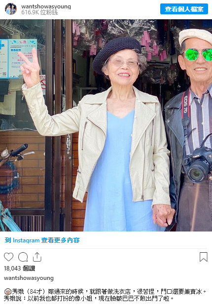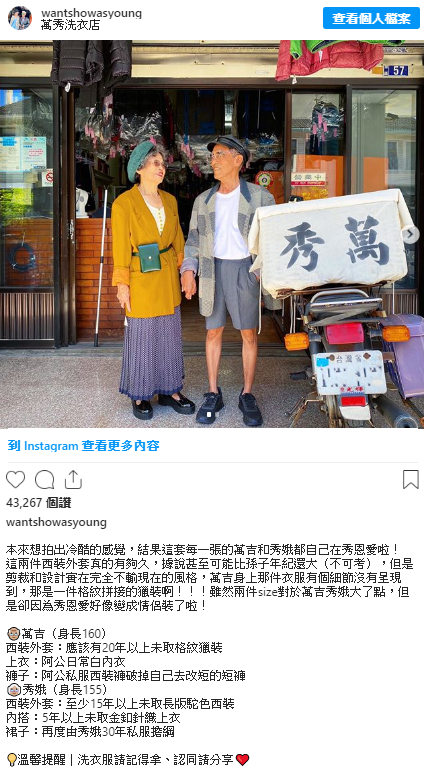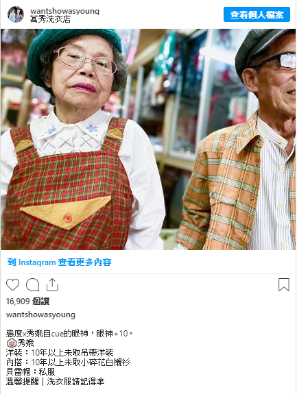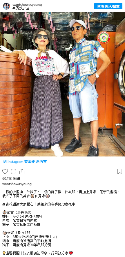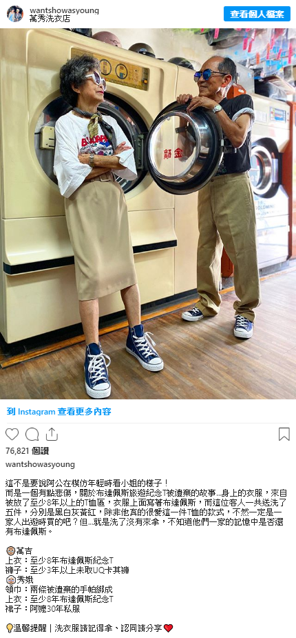 另外據說這個名為@wantshowasyoung的IG帳號,除了取諧音wantshow,並希望兩人即便高齡84歲仍能as young之外,更憑著感人的故事以及有型的古著穿搭,因此即便才創立不到一個月的時間,如今就已湧入超過2萬人的追蹤數,甚至有不少年輕人都紛紛留言,想要買阿公、阿嬤身上的古著單品!