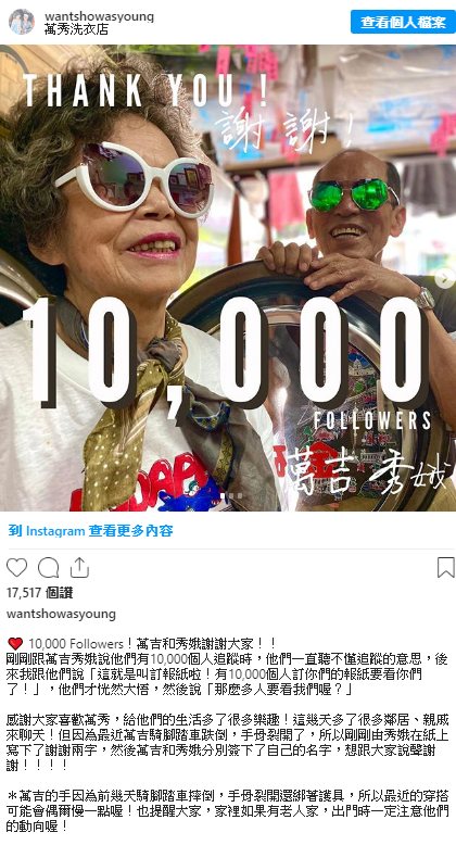 造成如此盛況後,孫子也立刻告訴兩老這個好消息,「剛剛跟萬吉秀娥說他們有10,000個人追蹤時,他們一直聽不懂追蹤的意思,後來我跟他們說『這就是叫訂報紙啦!有10,000個人訂你們的報紙要看你們了!』後,他們才恍然大悟地驚呼『那麼多人要看我們喔?』」