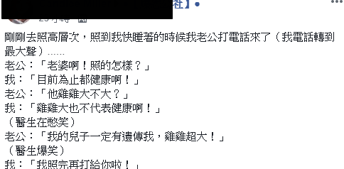 老公的一席話讓在醫院的她有夠尷尬,現場的醫護人員也全部都在憋笑,讓她臉都不知道要往哪裡放了!沒想到老公還不善罷干休,馬上又補了一句:「我的兒子一定會遺傳我拉,我的雞雞超大!」讓醫生直接忍不住大爆笑!