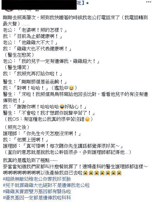 不少網友分享,都會在產房遇到這樣的「幽默」,紛紛留言:「真的每次老公都讓人想翻白眼!」、「之前在產房生完,我老公還很開心來說:『我看過了老婆,是大雞雞,超大!』讓我直接白眼他!」、「老公都很愛誇自己!」還有網友開玩笑:「現在全台灣都知道妳老公不怎麼樣了!」笑翻一堆人。