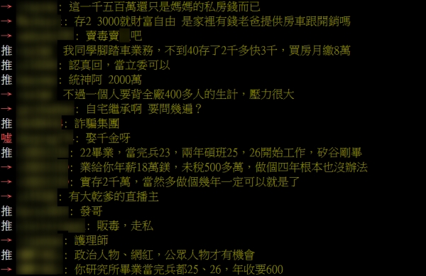文章一出馬上有網友跳出來表示「根本不可能」、「除非家裡有企業」、「娶千金啊」、「有大乾爹的直播主」、「會中15億的護理師」,也有不少人歪樓提出一堆犯法的行為。