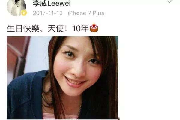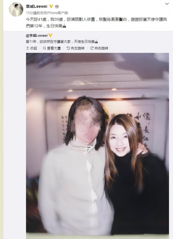 去年的11月13日李威就在微博寫下,「今天妳41歲,我39歲,妳清麗動人依舊,我髮絲漸漸鬢白,謝謝妳當天使守護我們第12年,生日快樂。」值得注意的是,李威特地將自己的臉打上馬賽克,只留下許瑋倫甜美的笑容,最後加上黑色蛋糕圖案,讓許多網友看了十分感慨。