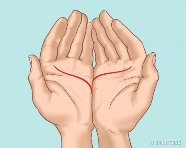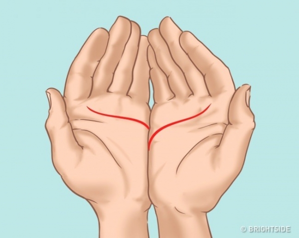 如果你是兩條合起來左手比較高的人(就像上圖那樣),那你其實是個內心堅強且比較外向型的人,這樣的你是很期待來場刻骨銘心的戲劇化愛情的。擁有這種手相的人很有可能會喜歡上比自己小的人、或是不同國家的人。這種類型的人相當獨立、有明確目標,而且容易克服困難。