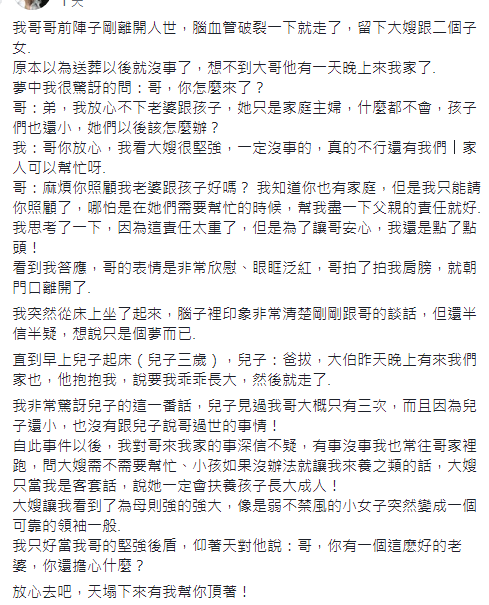 原PO發文表示,前陣子因腦血管破裂,離開人世的哥哥晚上出現在自己夢中,對方告訴他,他放心不下老婆跟孩子,老婆只是家庭主婦,什麼都不會,孩子們也還小,不知道他們以後該怎麼辦?