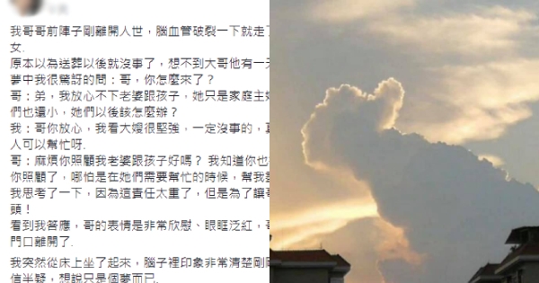 有名男子於(4)日在臉書社團「靈異公社」發文提到,自己的哥哥前陣子因腦血管破裂離世,留下妻子跟2名子女,有天晚間他突然夢見哥哥託孤,醒來後對於夢中的細節仍印象深刻。