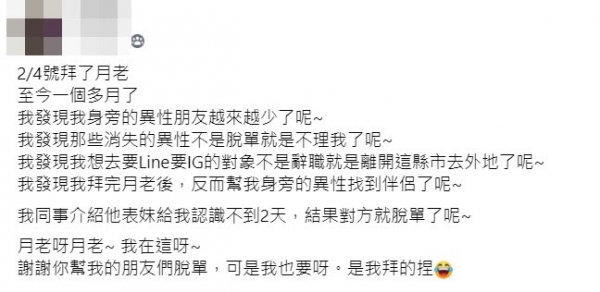 根據ETtoday報導,男網友在臉書社團「爆廢公社二館」上PO文表示,雖然自己今年2月4日曾去拜月老,但至今一個月內身旁的異性朋友卻越來越少,大家不是脫單不然就是都不理他,讓當初抽到上上籤的他頓時感到相當不解與無奈...