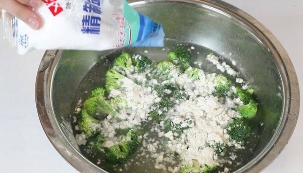 然後添加一勺麵粉,麵粉可以帶走花椰菜上的泥沙污垢,