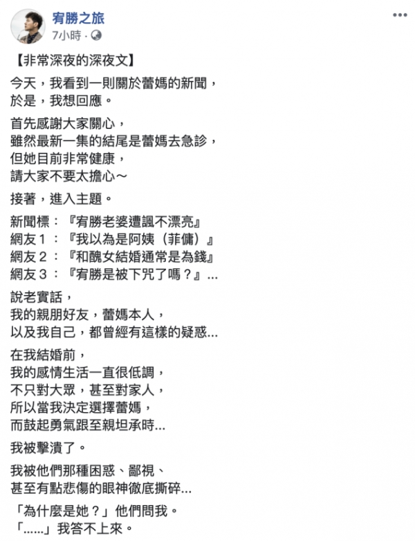 對此,宥勝深夜分享了千字文,坦承結婚前曾和蕾媽分手過,迅速和一名白富美女友交往,不過他發現自己已經確定蕾媽就是「對的人」,回頭復合,最後甚至共組家庭、追逐夢想。