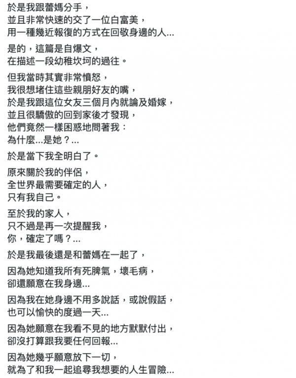他自認如此行為相當幼稚,但當時他很憤怒,想堵住親朋好友的嘴,「於是我跟這位女友3個月內就論及婚嫁,並且很驕傲的回到家後才發現,他們竟然一樣困惑地問著我:為什麼…是她?」