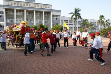 當天校方在學校大門口設香案,由校長徐步魁率領各一級主管馨香列隊迎接媽祖婆、王爺等眾神明的駕到,媽祖婆一進入校園,就直指校園操場的廢棄碉堡有許多厲鬼,由於當地屬白砂崙萬福宮管轄,媽祖婆除逕赴萬福宮向王爺公打聲招呼外,並立即調兵遣將聯合廟內另六頂神轎包括大王公、二王公、三王公、四王公、五王公和副媽長驅直入至操場驅鬼。