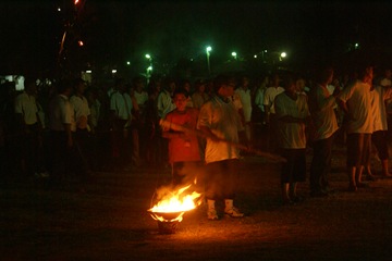 據當天全程參與驅鬼行動的鄭姓信眾表示,媽祖婆先透過道長黃啟擇在司令臺附近好言規勸鬼王降伏,希望好兄弟們知難而退,不要再盤據校園危害無辜師生,但長年佔地為王的鬼王,不甘如此輕易地就讓出地盤,堅決不肯退讓,神鬼談判宣告破裂,媽祖婆只好決定來硬的,當場指揮另六頂神轎和十陣龍、獅武陣佈陣,並擺出七個熱滾滾的油鍋伺候。