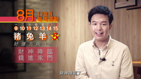 最後,湯鎮瑋總結本週最佳財運為生肖「豬」,可多把握好運氣來努力拼一下。事業運最旺生肖為「猴」,這禮拜會感到環境的變動或勞碌,但事業上帶來的成就感會讓你很開心。