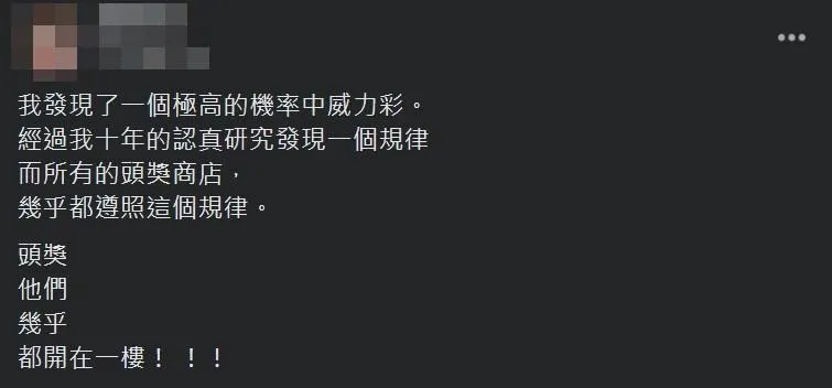一名網友今(15日)在臉書「爆廢公社二館」分享,他發現了一個極高的機率中威力彩。「經過我10年的認真研究發現一個規律」,他指出,所有開出頭獎的彩券行,幾乎都遵照這個規律。