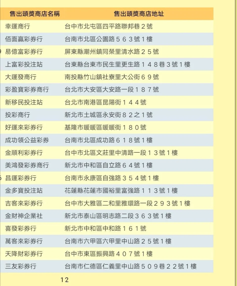 只見他附上一張歷年來售出頭獎的彩券行,列出所有商店名稱與地址,遍布北北基、台中、南投、台南、屏東,以及花蓮。該網友揭曉答案,表示「頭獎他們幾乎都開在一樓!!!」