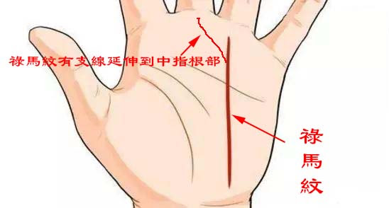 「祿馬紋」起點處再生出一條支線,延伸到中指根部的話,為大富之相格,主其人在事業上發展非常順利,很容易出成就,財運也是特別旺盛,一生錢財不斷。