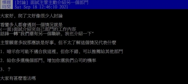 原PO於PTT上發文,表示發現蠻多人面試時會遇到主管介紹完部門工作內容後,便話鋒一轉說「我們還有另一個職缺,我也介紹一下」。這便讓他不解詢問「主管願意多說那應該是好事,但不太了解這個情況代表什麼」。