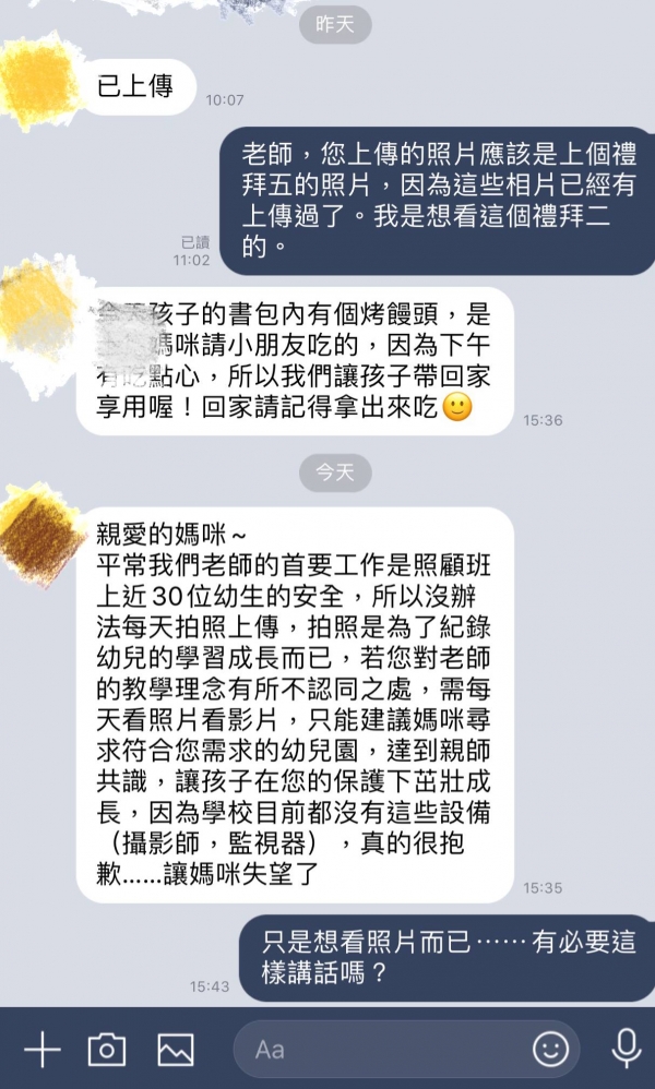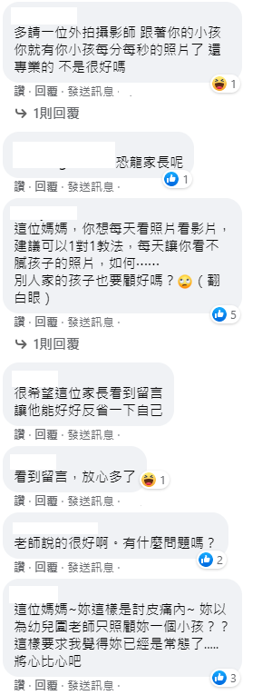 「恐龍家長呢」、「看到留言,放心多了」、「老師說的很好啊。有什麼問題嗎?」、「啊妳自己上班怎麼不會錄影傳給老師看?」、「只能說這家長是恐龍家長」、「這個媽媽好好笑,還指定哪天的照片」、「妳可以高薪請一位會照相的,且一對一的老師帶妳的小孩」