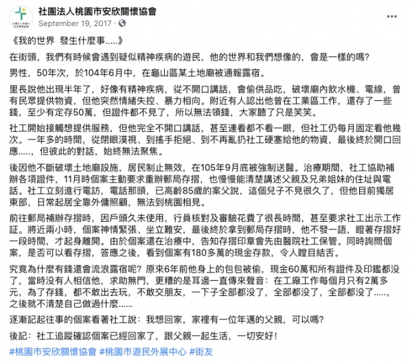 像是過去在桃園,就有一位56歲的街友,疑似精神狀況不太好,常常在附近鬧事,還不斷對周遭的人說,自己有定存50萬元,直到社工前去關心,才發現令人心酸的故事....