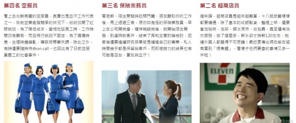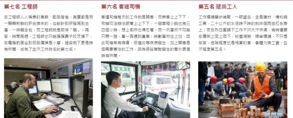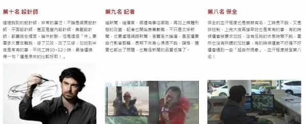 被網友認為第3血汗的工作則是保險業務員,他們因為底薪低,需要主動去將陌生人開發成客戶。在完成拜訪客戶的工作後,要和主管討論檢討,回家後還要繼續研究保單,工作內容真的相當多。其他被認為也相當血汗的工作還有拿體力換工資的建築工人、經常工作到過勞倒下的工程師,和薪水是論件計酬的設計師。