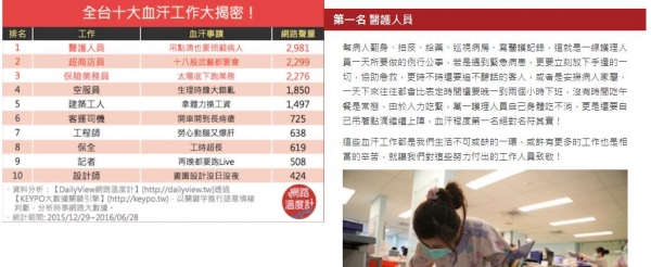 被評選為「台灣10大血汗工作」第1名的是醫護人員,醫護人員除了要巡視病房、協助急救病人外,有時還要安撫不聽話的病人家屬,一天工作下來的時數往往比表定時間長上許多。血汗程度僅次于醫護人員的工作則是台灣的超商店員,他們的時薪雖只有120元左右,卻必須會上架商品、收銀、泡咖啡,有時還要處理洗衣服務,因此被認為是第2血汗的工作。