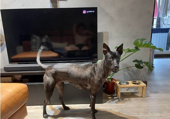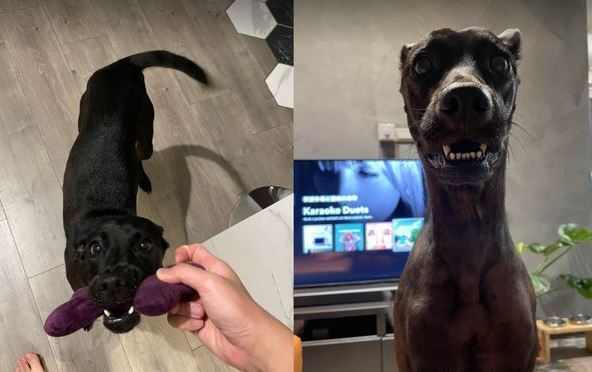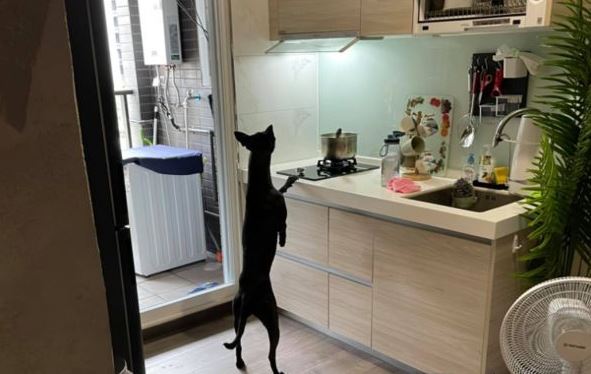 飼主Pohsien Chiang日前在家裡煮麻辣鴨血,結果回到廚房,驚見爐火前方冒出一隻「長脖工讀生」在顧。定睛一看,發現是3歲小屁孩黑狗「悟空」想偷吃,這下爸爸俏皮地說「哼!我才不會給你吃呢」。