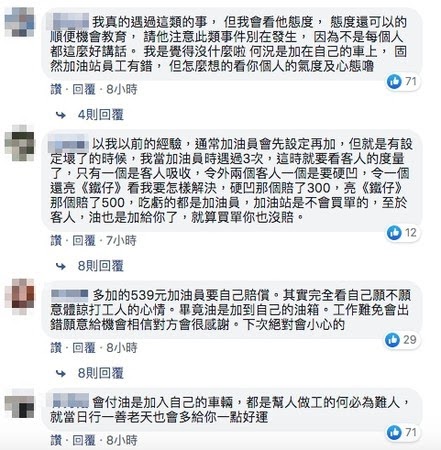 「做過加油站快一年,有時候真的是機器設定問題,基本上表達出非常不好意思的態度,客人都會自付,但是遇到亮武器的或是不好說話的,都是自己吞了,站長也根本不想鳥你的,三五天又少錢的,薪水都賠進去了,只能說加油站真的不好做」。