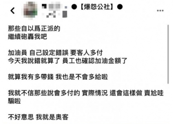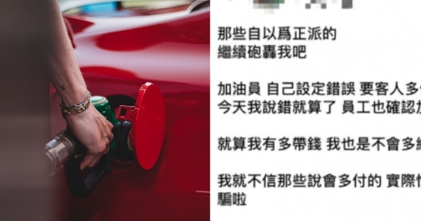 強調「加油員自己設定錯誤要客人多付,今天我說錯就算了,員工也確認加油金額了,就算我有多帶錢我也是不會多給啦 ...不好意思,我就是奧客!」