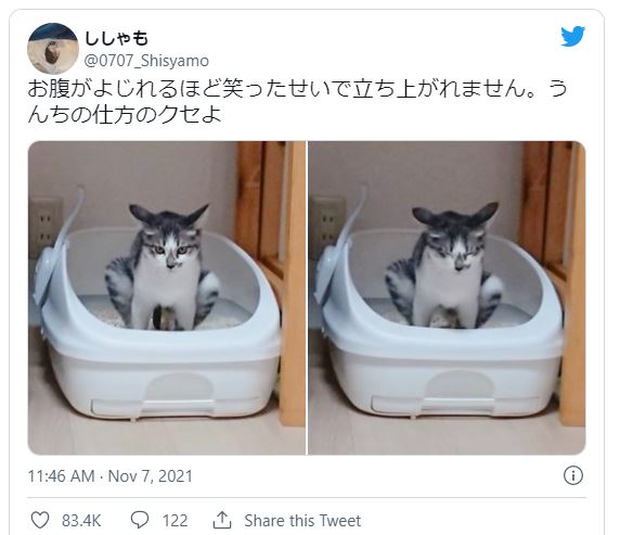 推文一出,網友們也笑翻,紛紛留言表示,「不論做什麼都很可愛誒」、「好獨特的便便方式」、「很像小鳥停在樹上的樣子」、「跟相撲選手好像」、「隔著螢幕都能感覺到牠的用力」。