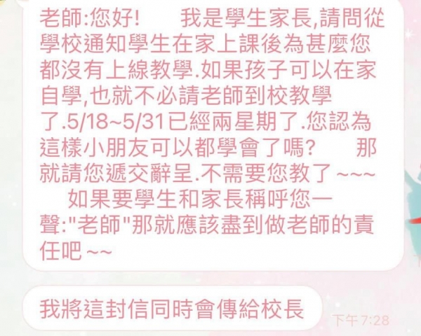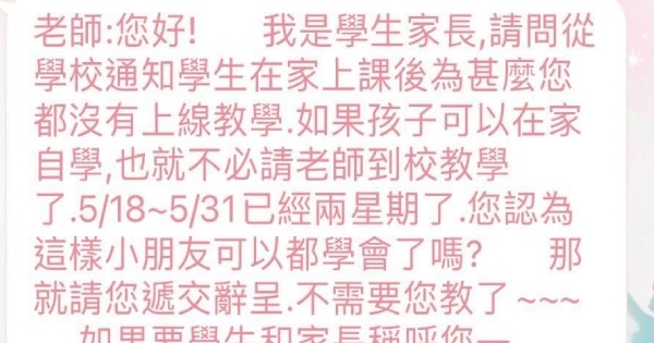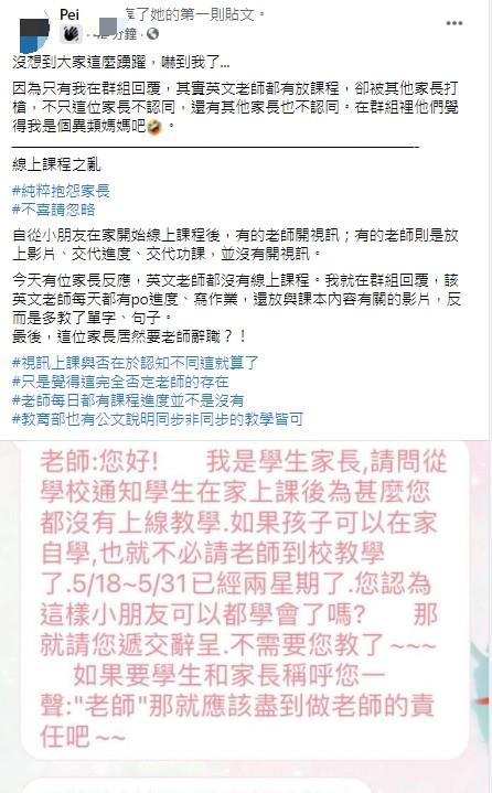 「線上教學釣出多少不負責任的恐龍家長,有進度有影片還有寫作業,是要多不用心才不了解孩子在上些什麼課,自己爛還叫老師辭職」