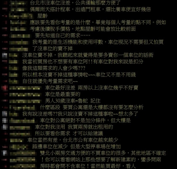 針對有無車位,網友卻兩派看法,「車位當然有差,台北市公有車位越來越少」、「車位最好沒差,兩房以上沒車位幾乎不好賣,車位是最重要的」;「雙北小兩房交通方便的,不買車位的人很多,其他地區不確定」、「車位對公寓絕對不是加分條件,但大樓是」、「車位賣不掉,覺得是要多賣你一個車位的話術」、「我當初買房也不想要有車位啊,有車位對我來說是扣分...根本沒賣不掉這種事情啦,車位又不是不用錢,自住就優先考量需求吧」。