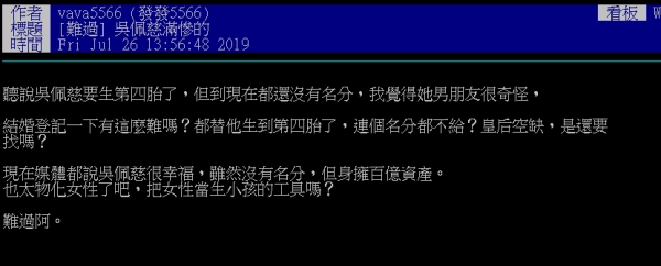 不過有網友PO文問,吳佩慈至今都沒有名分,是不是滿慘的